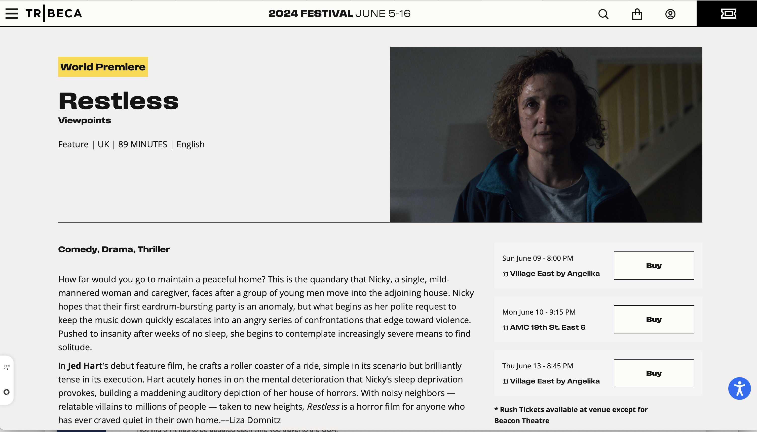 We're thrilled that restless will get its world premiere on June 9th at Tribeca 2024. Watch out NYC! Tickets and details here: